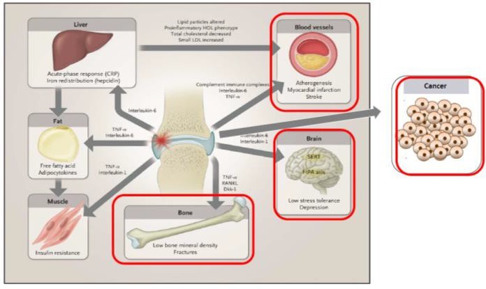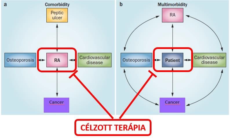Összességében pedig azt az új multimorbiditás koncepciót igyekszünk beültetni a hazai gyakorlatba, hogy amíg a klasszikus felfogás szerint egy krónikus betegség (pl. RA) állt a középpontban, és ennek voltak társbetegségei, addig inkább magát a beteget kell a középpontba állitani és az alap- (RA), valamint társbetegségeket egyszerre, holisztikusan kezelni, valamint a megelőzést folytatni.