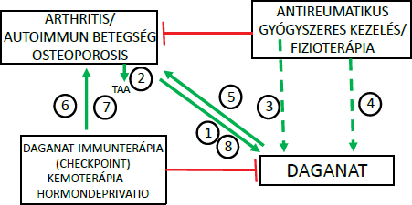 „onkoreumatológia” diszciplínát definiálva megalapítottuk a HORN (Hungarian OncoRheumatology Network) kutatócsoportot. Nyolc kapcsolódási pontot azonosítottunk az onkológia és a reumatológia/autoimmunitás között. RA betegeink csaknem 3%-ában alakult ki malignus daganat. Elsők közt közöltük a tumor-asszociált antigének (CEA, CA19-9, CA15-3, CA125) fokozott termelődését RA-ban, amely alapján megállapítottuk, hogy gyulladásos betegekben a tumormarkerek nem alkalmasak tumorkeresésre. Részletesen elemeztük az