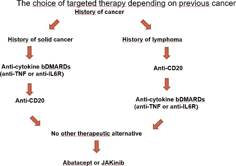 Egyes az RA kezelésében alkalmazott reumatológiai gyógyszerek, elsősorban a célzott terápiák esetében is felmerült, hogy fokozzák-e a daganatrizikót és adhatók-e korábbi malignitás esetén. Magam részt vettem abban az EULAR munkacsoportban, amely ajánlást fogalmazott meg ebben a kérdéskörben (https://drive.google.com/file/d/1tMJt0Ngo1sSmqITrXBLJyWW8A6Dmu1l- /view?usp=sharing).