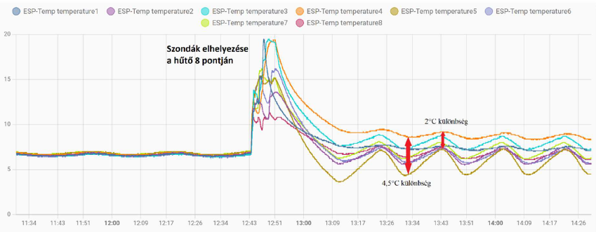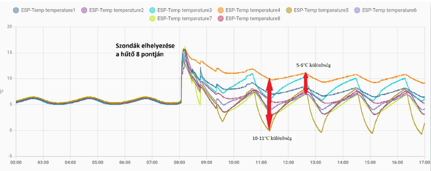 Egy szenzorral vizsgálva a kontroll megfelelőnek tűnik, a hőmérsékleti grafikonok kiértékelése szerint minden rendben van. Azonban ahhoz, hogy nyomon tudjuk követni, mi történik valójában a hűtőink belsejében különböző pontokon, készítettem egy 8 szondával rendelkező hőmérőt. Mind a 8 szondát 0 és 25 Celsius fok között négy ponton kalibráltam. Az így szerzett adatok alapján könnyen beazonosíthatók azok a zónák, ahol esetleg túl magas vagy túl alacsony a hőmérséklet. Egy hűtőn belül vizsgálva is találkozunk eltérésekkel, de a különböző típusú hűtőinket is összehasonlítottam és hőeloszlás tekintetében itt is jelentős különbségeket figyeltem meg.