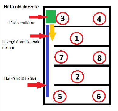 Szondákat ugyanazon séma szerint pozícionálva a légkeveréses hűtőben a tapasztalatok hasonlóak, de a különböző ponton elhelyezett szenzorok által mért hőmérsékletek közötti eltérés lényegesen kisebb a közönséges hűtőkéhez képest.