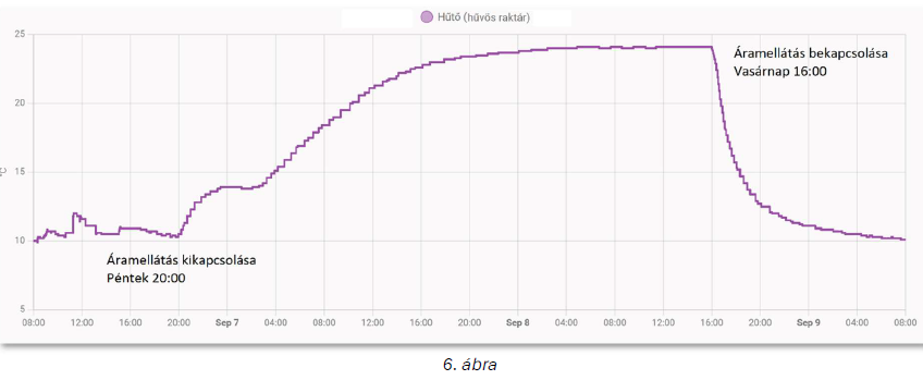 Annak a hűtőnek az áramellátását én kapcsoltam ki péntek este 8 órakor, és vasárnap 16 órakor pedig vissza, ezzel egy vihar okozta áramkimaradást szimulálva (6. ábra).