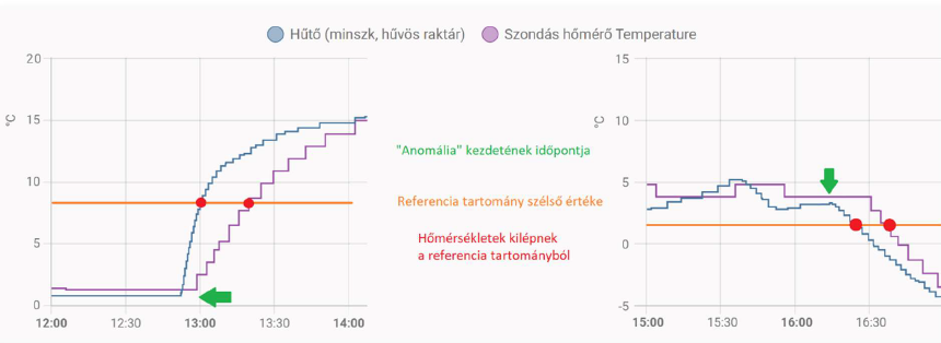 A pénteki és a hétfői szemrevételezéskor, a papír naplóban rögzített értékek szerint minden rendben volt. Az érme jégen keresztül való vándorlása viszont arra enged következtetni, hogy a két leolvasás közötti időszakban történt valami a hűtővel. A grafikon adatait elemezve jól látszik, hogy a hétvégén a mélyhűtő tartalma kiolvadt, majd vasárnap este ismét megfagyott, eközben több mint egy napig referencia tartományon kívül esett annak hőmérséklete. Egy ilyen esetben a papíron vezetett hőmérséklet ellenőrzési napló mellett, még ha az a szakmai és jogi szabályoknak maradéktalanul meg is felelnek, a gyógyszerek minőségi változása rejtve marad. Egy automatikus rendszer használatával, amely folyamatosan figyeli a hőmérsékleti értékeket, az ilyen események könnyen megelőzhetőek és azonnal kezelhetőek lennének.