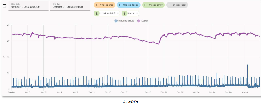 amelyben az adatok külső beavatkozás nélkül detektálódnak, kerülne rögzítésre, és azok a lehető legpontosabbak. Ennek köszönhetően a rendszer kevesebb erőforrás igénybevételével folyamatos és megbízható hőmérsékleti kontrollt tesz lehetővé, minimalizálva az emberi vagy műszaki hibákból fakadó kockázatokat. A rendeletben foglalt 1 évig, pontosabban a felhasználó által kívánt ideig, tárolja a keletkezett adatokat. Ennek visszakereshetőségére lehetőséget kínál a kezelőfelület, ahol a felhasználó által választott intervallumra akár több szenzor adatai egyszerre megjeleníthetőek. Az 5. ábrán ennek egy részlete látható, ahol az inzulinok tárolására szolgáló hűtőnk és a labor 2023 októberi hőmérséklet adatait jelenítettem meg. Megjegyzés: A hűtő hőmérsékletgörbéjén látható „tüskék” az automata leolvasztó funkció működésének jelei.