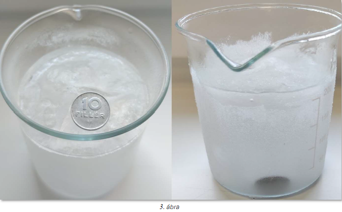 Pénteken egy főzőpohárnyi vizet helyeztem a fagyasztóba (3. ábra), amely miután megfagyott, a tetejére helyeztem egy érmét. Hétfőn reggel újra megvizsgáltam a főzőpoharat, és azt tapasztaltam, hogy a pénzérme ekkor már a pohár fenekén volt, a jég alatt. A hőmérő és az az alapján a naplóban rögzített adatok szerint a hűtő megfelelően működött, a hőmérséklete a referencia tartományon belül volt, és nem volt észlelhető eltérés.