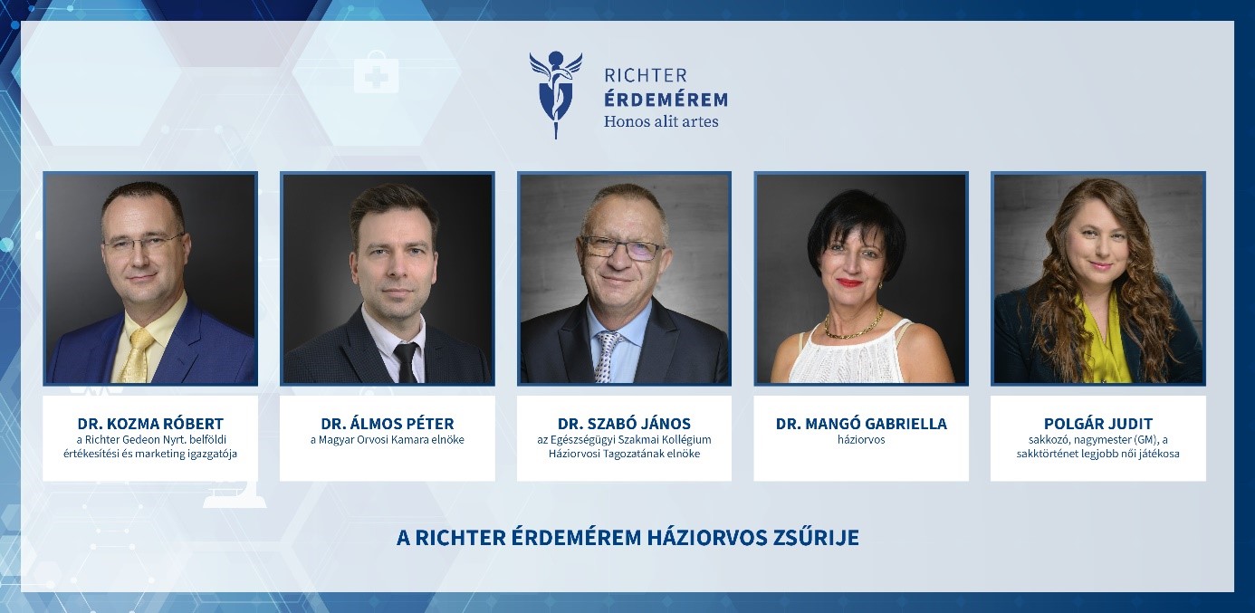 Dr. Álmos Péter, a Magyar Orvosi Kamara elnöke; Dr. Szabó János, az Egészségügyi Szakmai Kollégium Háziorvos tagozatának elnöke; Dr. Mangó Gabriella, háziorvos; valamint Polgár Judit, sakkozó, nagymester (GM), a sakktörténet legjobb női játékosa alkotta zsűri kiemelte, hogy a Richter Érdemérem elnyerésére az idei pályázati időszak során is számos kiváló pályázati anyag került benyújtásra, ami méltán bizonyítja, hogy a Díj jelentősége orvosszakmai körökben is évről-évre növekszik.