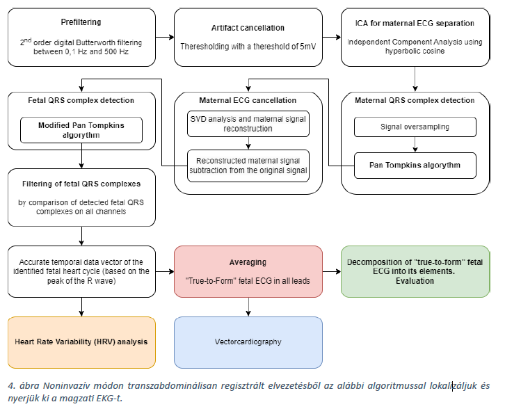 A nem invazív módon mért magzati EKG (f-ECG) kinyerését számos tényező nehezíti. Egyrészt az anya hasfalán – hagyományos EKG elektródákon keresztül – mérhető magzati EKG jel amplitúdója nagyságrendekkel kisebb, mint a felnőtt szív által generált elektromos jel intenzitása (10-150μV ↔ 1-2mV), ami egyébként párhuzamosan jelen van a felvételen. Más-részt a regisztráció minőségét és tisztaságát számos egyéb tényező is befolyásolja, vagy éppen rontja: pl. 1. a magzati és anyai izomtevékenységből származó, úgynevezett „mozgási műtermékek” (EMG aktivitás), 2. a magzati agyi aktivitás EEG jelei, 3. a hasznos jel számos különböző dielektormos tulajdonsággal rendelkező biológiai közegen kell áthaladjon, ráadásul a magzat-máz (vernix caseosa) bizonyítottan frekvenciafüggő vezetőképességgel bír, mely π/2 radián fáziseltolódást is okozhat (1). A magzat mozgása ugyanakkor nem kiszámítható és nem is befolyásolható (a vizsgálat érdekében). Vajúdás során számolnunk kell az anyaméh simaizom akti-vitásával, és nem elhanyagolható a napjainkban gyakorlatilag mindenhol megtalálható „elektro-szmog” jelenléte sem.