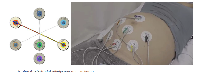 A mintavételezést az anyai hasfalon elhelyezett közönséges Ag-AgCl elektródákon keresztül végezzük, jelenleg három pár elektródán és egy aktív földelésen keresztül. Az elektródák elhelyezése általunk standardizált, az egyes elvezetések egymással 60 fokos szöget zárnak be. A későbbiekben tervezzük specifikus „szőnyeg-elektróda” kifejlesztését, mely a mindennapi fel-használást megkönnyíti. Terveink szerint elegendő, ha a várandós az elektróda „patch”-et a megfelelő módon a hasára ragasztja, melynek mágneses csatlakozójára illeszkedik a gyufásdoboz nagyságú biológiai erősítő.