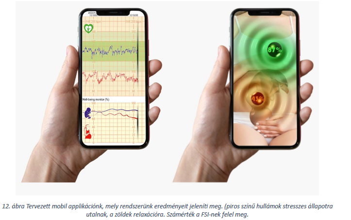 Az elmúlt években egyre több cikk foglalkozik a f-ECG STV analízissel. Kidolgoztak egy új mutatót is, melyet fetal stress indexnek (FSI) neveztek el. (28) Saját fejlesztésű rendszerünkben mindezektől függetlenül készítettük el saját paraméterünket, mely a Poincaré diagramból származtatható, és az egymást követő értékek, valamint a diagram 45°-os tengelyével alkotott terület 5-10 másodperces intervallumok tér-integráljából számítható ki. Az így nyert értékeket 0 és 100% között skáláztuk. 100% a tökéletes relaxációnak felel meg, zöld színnel jelöltük, 0% az elméletileg lehetséges maximális stresszhelyzetnek felel meg, piros színnel jelöltük. A kettő között színátmenetet alkalmaztunk.