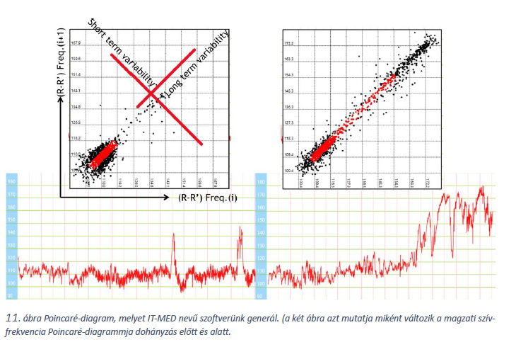 „PoinCare ábrázolás (11. ábra): A HRV jellemzésére jól használható a Poincaré-diagram. tRR(i) függvényében ábrázolva a tRR(i+1) értékeket, ponthalmazt kapunk. A ponthalmaz szélessége a rövid idejű variabilitást (short-term variability), a ponthalmaz hossza a teljes variabilitást (total variability) jellemzi. Matematikai nyelvre lefordítva a szívfrekvencia rövid távú variabilitása nem más, mint az RR távolságok másodrendű deriváltja, melyet hisztogramon is lehet ábrázolni. A Poincaré-diagram paraméterei nem feleltethetők meg egyértelműen a frekvencia-tartomány béli jellemzőknek, de bizonyos feltételek mellett hasonló az indikációjuk. A pillanatnyi stresszállapot a szélességgel vagy a pontok 45°-os egyenestől mért távolságának szórásával (transzverzális szórás) jellemezhető. Kisebb érték magasabb stresszállapotot jelez.” (27)