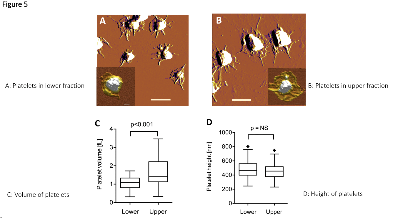 Vérlemezke AFM képek (A, alsó frakció; B, felső frakció, C, vérlemezkék volumene és D, magassága):
