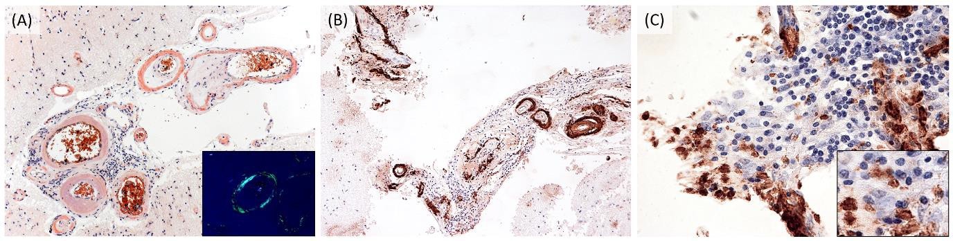 2. ábra. A neuropatológiai diagnózis. (A) Kongó vörös pozitív amyloid érbetegség a lágyagyhártyában és az agykéregben, jellegzetes almazöld felfénylést mutatva a polarizációs mikroszkóp alatt. (B) Az immunhisztokémia alapján az érfelakban amyloid-β rakódott le, igazolván a CAA diagnózist. (A-C) Az erek körül limfocitákat és makrofágokat tartalmazó masszív gyulladásos beszűrődés mutatkozik, ami CAA- RI-t jelez (perivascularis altípus). (C) A gyulladásos beszűrődésben amyloid-β fehérjét tartalmazó falósejtek jelzik az immunrendszer aktív eltakarítási kísérletét.