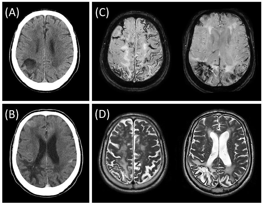 „fekete” szalagok), lebenyi mikrovérzések (jelszegény pöttyök) és makrovérzések (jelszegény szélű nagyobb állományi eltérések), a mély agyterületek érintettsége nélkül, CAA-ra jellegzetes módon. (D) Összefolyó aszimmetrikus T2 jelintenzív (világos) ödémás eltérések, melyek gyulladásos CAA-ra (CAA-RI) jellegzetesek.