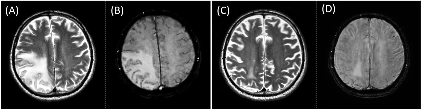 3. ábra. Remisszióban lévő CAA-RI betegeink egy reprezentatív esete. (A) Néhány nap leforgása alatt kialakult súlyos jobb agyféltekei tünettan, hallucinációk és epilepsziás rosszullét hátterében kiterjedt T2 jelintenzív agyödéma igazolódott. (B) A vérzésre érzékeny szekvencián az ödéma és a felette lévő agykéregrészekben észlelhető számos, mikrovérzésnek megfelelő pontszerű apró jelszegény (fekete) eltérés együttesen CAA-RI-re utal. (C) Nagy dózisú vénás szteroid kezelés után 2 hónappal a beteg neurológiai és kognitív állapotának teljes helyreállását a T2 jelintenzív ödéma csaknem teljes eltűnése kísérte. (D) A vérzéses eltérések száma nem nőtt tovább. (Két évvel később már az ödéma maradéka sem volt látható, az antiepileptikum is leállt.)