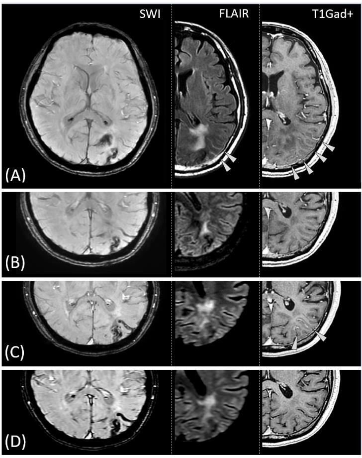 4. ábra. Új diagnosztikai entitások azonosítása CAA-RI-ben. (A) Egy CAA betegünknek a szuszceptibilitás súlyozott MRI szekvencián (SWI) látható vérzései környezetében a FLAIR felvételen a liquor jelintenzitása néhány barázdában megnőtt (sulcal non-nulling), ezen a területen a Gadolinium kontrasztos (T1Gad+) szekvencián kiterjedt lágyagyhártyai halmozás is jelen van. (B) Az eltérések 2 hónap alatt spontán elmúltak. (C) Fejfájáshoz és fokális epilepsziás görcstevékenységhez társulóan a lágyagyhártyai halmozás visszatért 4 hónappal később. (D) A halmozás és a tünetek nagy dózisú vénás szteroid terápiát követően ismét eltűntek. Tanulmányunk eredményei alapján a két jelenség fehérállományi ödéma nélkül is CAA-RI-re utal, a diagnosztikai kritériumok érzékenységét szignifikánsan növelik, valamint a terápiahatékonyság biomarkereiként alkalmazhatók.
